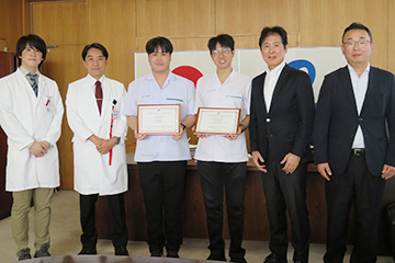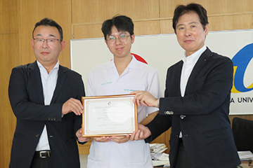 本学の整形外科学講座の研修に参加したKittipon Kodchakraiさん、Tanaboon Saeungさんが研修を修了し、整形外科学講座の加来信広教授より修了証の授与が行われました。