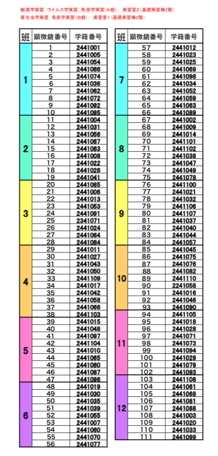 細菌学実習,ウイルス学実習,免疫学実習(A組): 実習室2(基礎実習棟2階)
