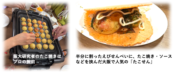 共同研究者である大阪大学医学部の茂呂和世先生の研究室を訪問し、今後の研究について打ち合わせを行いました。 夜には、茂呂研究室の皆さんが教室で「たこ焼きパーティー」を開いてくださり、和やかな雰囲気の中で親睦を深めました。 |