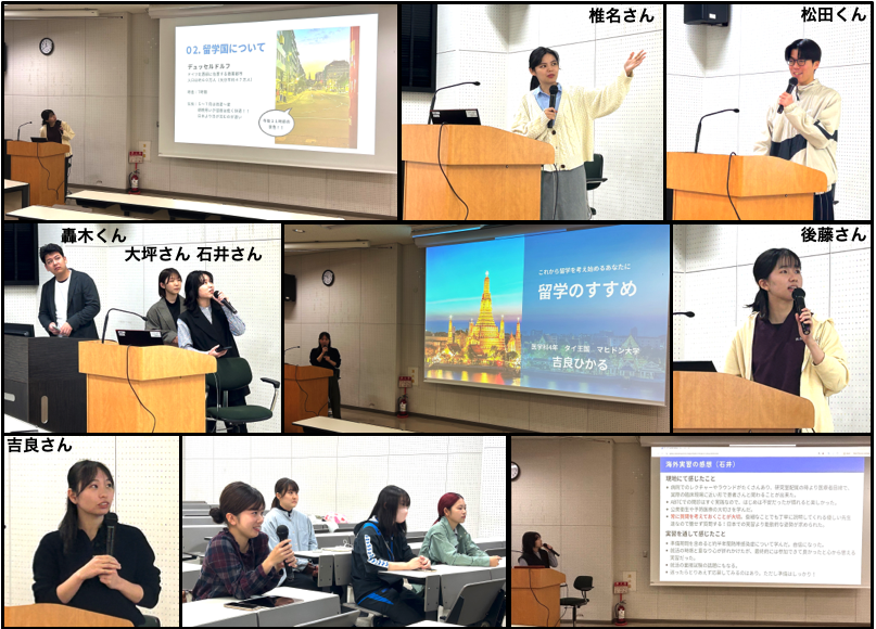 2025年11月1日(土)・2日(日)に開催された大分大学医学部祭において、医療展で学生による2つの展示企画「留学のすゝめ」と「寄生虫展」が行われました。本講座はこれらの学生企画をサポートしました。 (1)留学のすゝめ 本企画では、海外での臨床実習や研究留学を経験した学生たちが、後輩に向けて体験談を発表しました。 6年生の轟木くん、大坪さん、石井さんは、本学と協定を結ぶフィリピン・サンラザロ病院での臨床研修について報告しました。 また、5年生の椎名さん、4年生の吉良さん、後藤さん、松田くんは、研究室配属期間にタイおよびドイツの協定校での留学体験を紹介しました。 発表では、英語学習のコツ、海外生活の工夫、現地での医療の違いなど、実践的なアドバイスが多数語られ、これから留学を希望する後輩たちからも多くの質問が寄せられました。 |