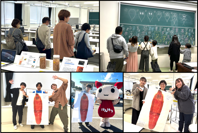 | (2)寄生虫展 学生が中心となり、食べ物を介して感染する寄生虫をテーマに標本を展示しました。回虫、アニサキス、日本海裂頭条虫、ランブル鞭毛虫などの標本が並び、来場者は興味深く観察していました。 一般の方々も多数来場し、医学生による丁寧な解説に熱心に耳を傾けていました。特に子どもたちは黒板にランブル鞭毛虫の絵をたくさん描くなど、楽しみながら寄生虫の世界に触れていました。 実際の標本展示や顕微鏡観察体験を通して、訪れた学生や地域の方々は寄生虫の生態や感染症予防について学び、医科学の奥深さを実感する機会となりました。 今年も、学生主体の企画を通じて、医療への関心と学びの輪が広がる有意義な医学部祭となりました。 |