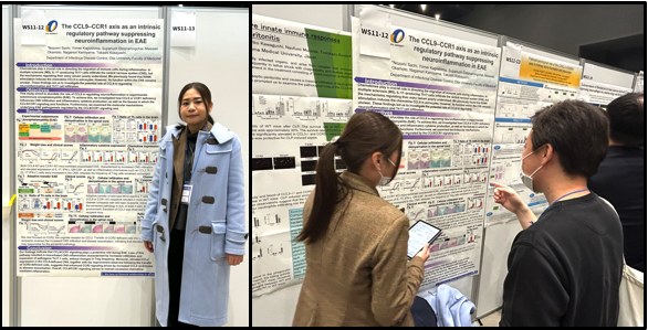 | Nozomi Sachi: The CCL9−CCR1 axis as an intrinsic regulatory pathway suppressing neuroinflammation in EAE Chemokines are key regulators of immune cell migration in inflammation and host defense. In multiple sclerosis (MS), IL-17−producing Th17 cells infiltrate the central nervous system (CNS), yet the mechanisms regulating their entry remain unclear. We found that RANK stimulation induced a CC chemokine, CCL9, in astrocytes. It has been reported that CCL9 is expressed in the follicle-associated epithelium and the dome regions of mouse Peyer's patches. However, its expression and function in the CNS remain unclear. We generated CCL9-deficient (KO) mice using CRISPR/Cas9 and induced experimental autoimmune encephalomyelitis (EAE), a murine MS model. CCL9 KO mice developed more severe disease, with increased CNS infiltration and elevated IL-17, IFN-γ, and GM-CSF expression. Th17.1 (IL-17+IFN-γ+) cells were increased in the brain, while Treg frequencies |