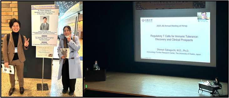 | Annual Meeting JSI 2025 (December 10–12, Himeji) From December 10 to 12, we attended the Annual Meeting of the Japanese Society for Immunology, held at ACREA Himeji in Himeji City, together with Dr. Sachi and Mr. Umeki. During the meeting, a video lecture by Professor Shimon Sakaguchi, the recipient of the 2025 Nobel Prize in Physiology or Medicine, was presented. As Professor Sakaguchi was attending the Nobel Prize Award Ceremony in Stockholm, Sweden at the same time, his lecture attracted significant attention from the audience. We also had the opportunity to interact with several research groups, including our collaborators from Professor Paraga’s group at Chulalongkorn University in Thailand, Professor Moro’s group at Osaka University, and Professor Kabashima’s group at Kyoto University. Through these exchanges, we actively discussed the latest research findings and future directions in immunology. Overall, the meeting provided a valuable opportunity to engage with cutting-edge immunological research while further strengthening our research network. |