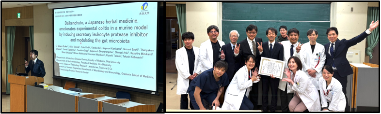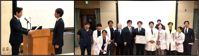 December 16, 2025: Dr. Sotaro Ozaka Receives the 15th Nakatsuka Medical Award On December 16, 2025, the award ceremony and recipient seminar for the 15th Nakatsuka Medical Award, an official research award of the Faculty of Medicine, Oita University, were held at the Clinical Lecture Hall of the Faculty of Medicine. The Nakatsuka Medical Award was established in 2011 in honor of Dr. Masayuki Nakatsuka, the first president of Oita Medical University, with the aim of promoting and advancing the research activities of young investigators within the Faculty of Medicine. This year, a total of five researchers were recognized across the fields of biomedical science, medicine, and nursing science. Among the awardees was Dr. Sotaro Ozaka, Assistant Professor in the Department of Gastroenterology. Although Dr. Ozaka currently belongs to the Department of Gastroenterology, he conducted his doctoral research in our Department of Infectious Disease Control, where he obtained his PhD degree. Following his doctoral training, he also served as an Assistant Professor in our department for two years, contributing significantly to both research and education. Notably, the research recognized by this award was carried out while Dr. Ozaka continued his clinical duties, and it represents the outcome of his persistent and dedicated research efforts conducted in close collaboration with our department. His achievement exemplifies the successful integration of clinical practice and basic research. At the award ceremony, Vice Dean Dr. Kobayashi provided comments on each awarded study, followed by the presentation of certificates and prizes by Dean Dr. Inomata. The ceremony was followed by a recipient seminar, during which each awardee presented their research. We are delighted that a researcher closely associated with our department has received this prestigious award. We extend our heartfelt congratulations to Dr. Sotaro Ozaka on this outstanding achievement. |