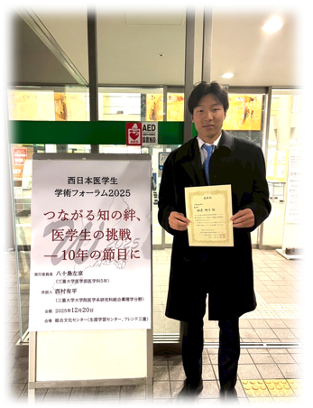 2025年12月20日 田邊君が西日本医学生学術フォーラムで口頭発表優秀賞を受賞しました 2025年12月20日、三重県総合文化センターにて第10回 西日本医学生学術フォーラムが開催され、当講座に研究室配属している 田邊映斗君が、口頭発表優秀賞を受賞しました。 田邊君は今年、本講座に研究室配属となり、神山先生の指導のもと、トキソプラズマの病原性因子に関する研究および大分県における人獣感染状況の疫学調査に取り組んできました。本フォーラムでは、これらの研究成果を口頭発表し、その内容と発表態度が高く評価され、今回の受賞につながりました。 また、本フォーラムでは、一緒に参加した川部梨々香さん(今年、花田礼子研究室に配属)もポスター発表を行い、ポスター発表最優秀賞(学生投票部門)を受賞しました。学生同士の投票によって選ばれる本賞の受賞は、研究内容のみならず発表の分かりやすさや熱意が高く評価された結果であり、本学における研究室配属教育のレベルの高さを示すものといえます。 なお、本フォーラムでは、昨年も当講座に配属していた 山本玲君が奨励賞を受賞しており、2年連続での受賞となりました。講座としても大変喜ばしく、同時に学生たちの着実な成長に驚かされています。 日々の研究に真摯に取り組み、発表に向けて努力を重ねてきた田邊君、そして川部さんに、心より祝意を表します。今後のさらなる活躍を期待しています。 |