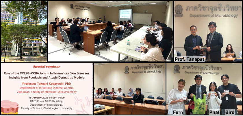 チュラローンコーン大学(Chula)昨年8月に続き、今回もチュラローンコーン大学理学部微生物学講座(Department of Microbiology, Faculty of Science)を訪問し、セミナーを行いました。セミナーでは、最新の研究成果について紹介するとともに、現地の研究者の皆様と活発な意見交換を行いました。また、昨年本学の研究室配属に参加した学生である Chaivis(Bird)さん、Salinthip(Phat)さん、Taniya(Fern)さんとも再会し、近況を共有することができました。 Tanapat Palaga 教授および Sita Virakul 先生とは、ダブルディグリープログラムについて協議を行い、大学院生交流における新たな可能性を確認しました。さらに Palaga 教授とは、二国間共同研究の計画についても意見交換を行い、今後の研究面での新たな展開が期待されます。 夜には、Palaga 教授、Virakul 先生に加え、大分大学大学院で学位を取得後、昨年より母校であるチュラローンコーン大学に復帰した Dr. Phawinee Subsomwong(愛称:Pha さん)とともに居酒屋で懇親の場を持ちました。さらに、シリラート病院で研修中の椎名さんも合流し、和やかな雰囲気の中で交流を深めることができました。 |