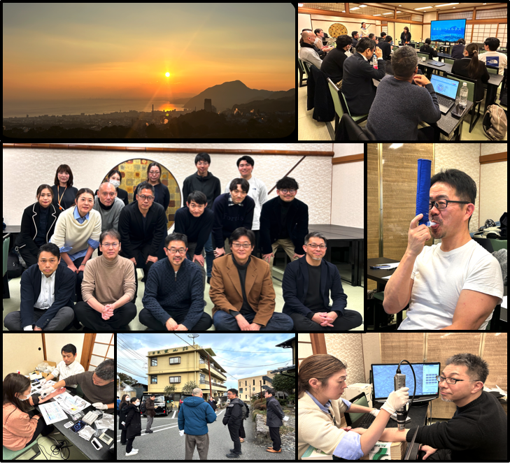 上段:(左)別府湾の日の出 (右)セミナーの様子 中段:(左)集合写真 (右)呼気測定する石井会長 下段:(左)入浴前測定 (中)入浴 (右)入浴後測定 |