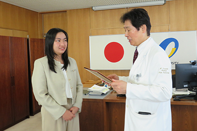 11月4日~11月28日、看護部では医学部と協定を締結しているプリンスオブソンクラー大学(タイ)から、看護師の研修生を受入れています。看護部が海外から研修生を受け入れるのは初めての事です。11月19日(水)には病院長を表敬訪問し、研修生から研修内容や日本での生活について報告を行いました。