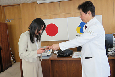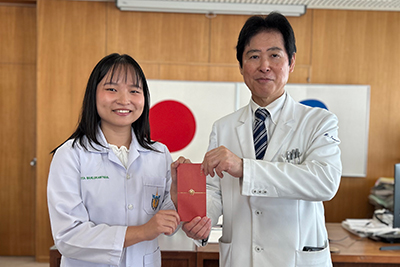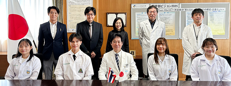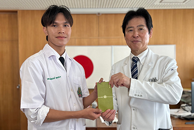 令和7年6月11日、大分大学と国際交流協定を結んでいるタイのチュラロンコン大学からの短期留学生3名へ、猪股医学部長から、医学部国際学術交流に関する留学生の受入れプログラム(協定校学部生)に対する助成金の授与が行われました。