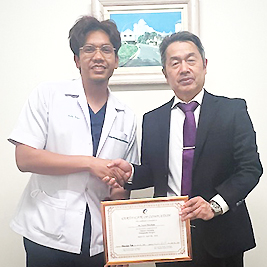 本学の整形外科学講座の研修に参加したKittipon Kodchakraiさん、Tanaboon Saeungさんが研修を修了し、整形外科学講座の加来信広教授より修了証の授与が行われました。