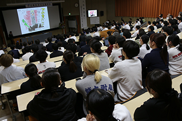 『人生紙芝居』と題した講演には、教職員や学生が多数参加し、講演終了後には、花束の贈呈も行われました。