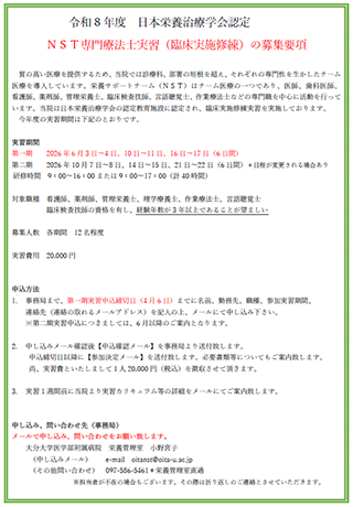 令和8年度日本栄養治療学会認定NST専門療法士実習(臨床実施修練)の募集要項を掲載しました[栄養サポートチーム(NST)]