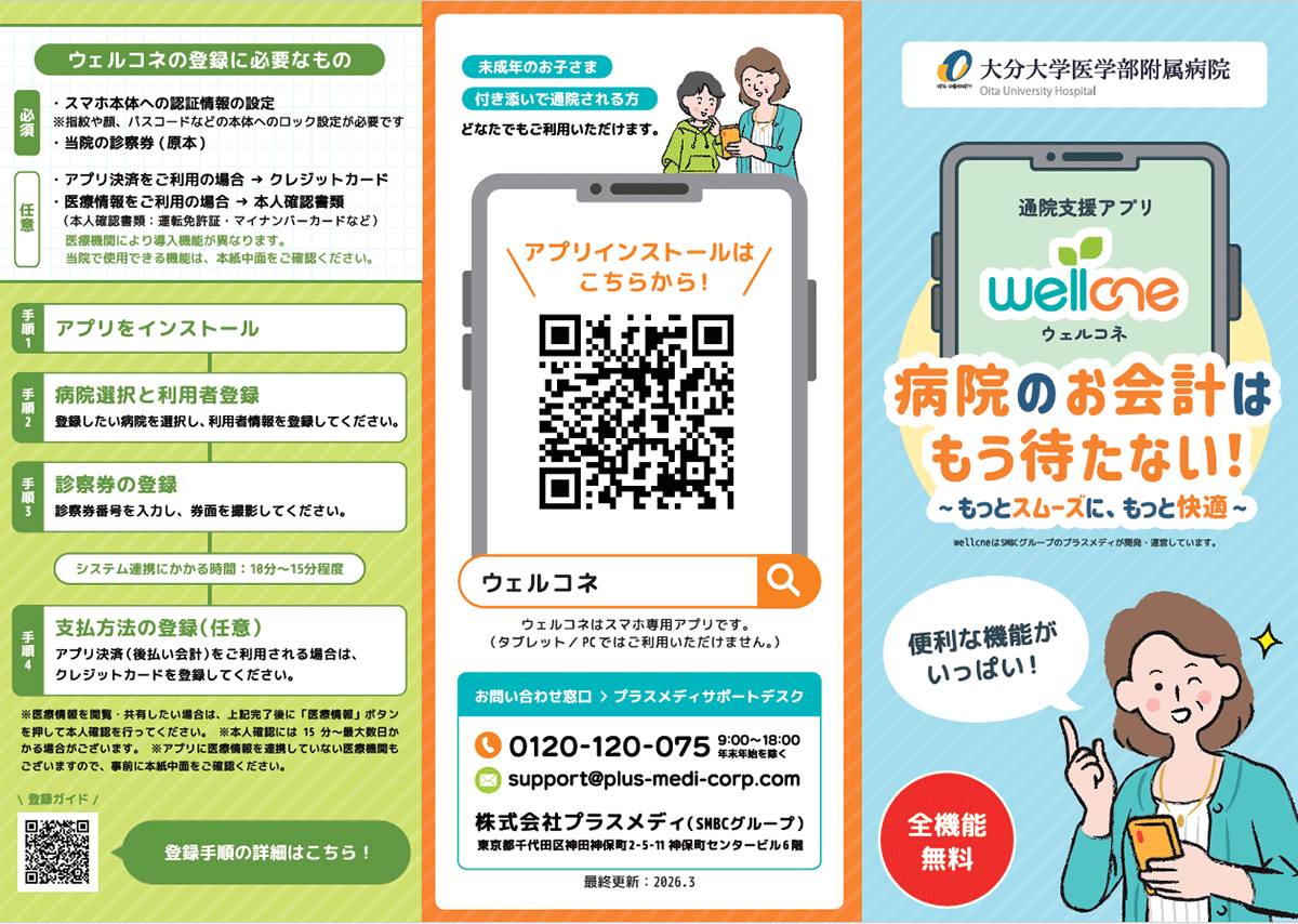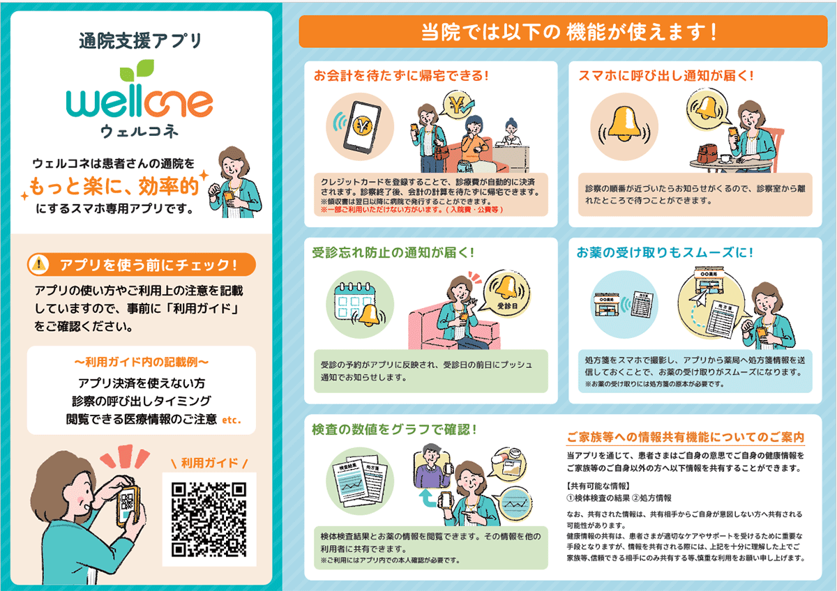 - 患者さんの待ち時間の短縮、病院内の混雑緩和及び患者さんの利便性の向上を目的として、通院支援アプリ「wellcne(ウェルコネ)」を令和6年4月1日より導入しました。