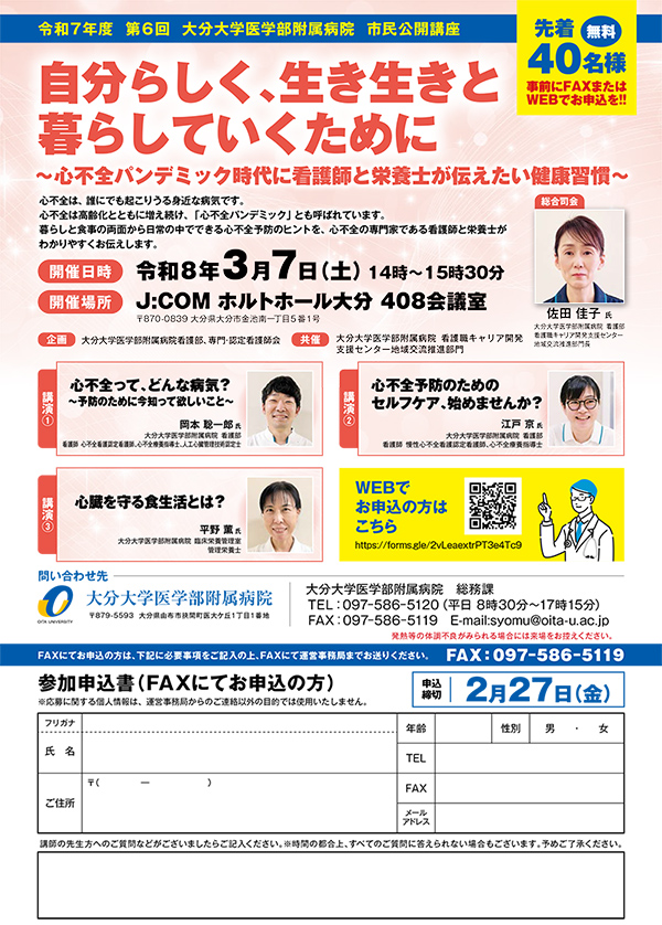 | 3月7日(土) | 14:00-15:30 J:COM ホルトホール大分 408会議室 自分らしく、生き生きと暮らしていくために~心不全パンデミック時代に看護師と栄養士が伝えたい健康習慣~ |