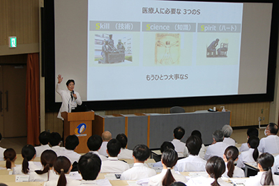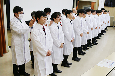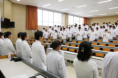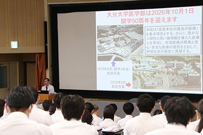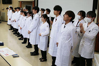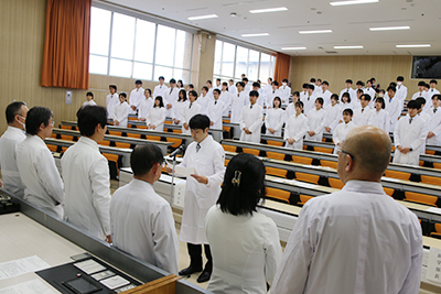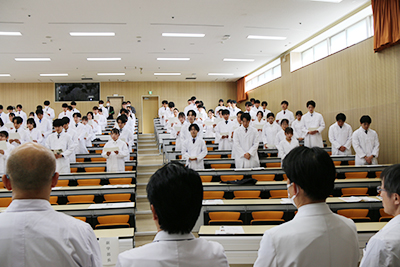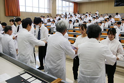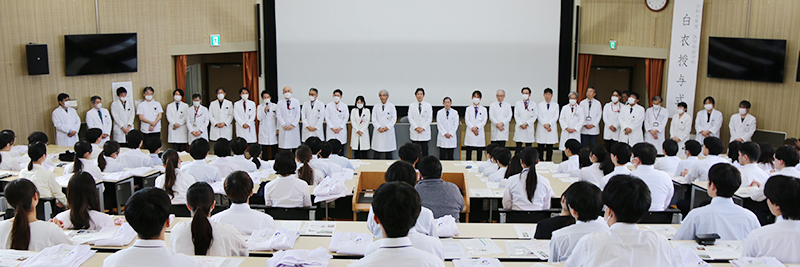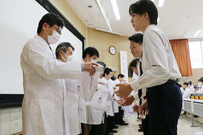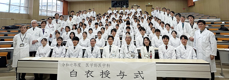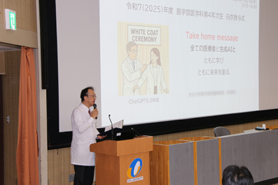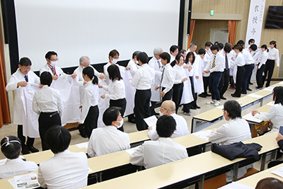 令和7年11月27日(木)に、臨床大講室で、医学科4年次生に対する白衣授与式が開催されました。まず、医学部長と病院長から、臨床実習に臨むにあたり、医療人に必要な資質やAI時代における人間力の重要性について話がありました。次に、大分大学医学部医学科同窓会(玉樹会)会長の高倉 健先生による特別講演がありました。阪神・淡路大震災での医療支援のご経験を踏まえて、先日発生した佐賀関の大規模火災に対する義援金のお願いから始まり、医療の現場での患者・家族に対するコミュニケーションの大切さなどについて講演されました。続いて、学生全員が順番に前に出て、先生方からネーム入りの白衣を着せていただきました。その後、学生代表が宣誓を行い、地域社会や医学の発展のために最大限の努力をすることを誓いました。さらに、学生全員が起立して皆で作成したプロフェッショナル憲章を唱和し、臨床実習への決意を新たにして式が終了しました。これから始まる実習を通して、学生の皆さんが一人の人間として、また医療人として大きく成長することを期待しています。